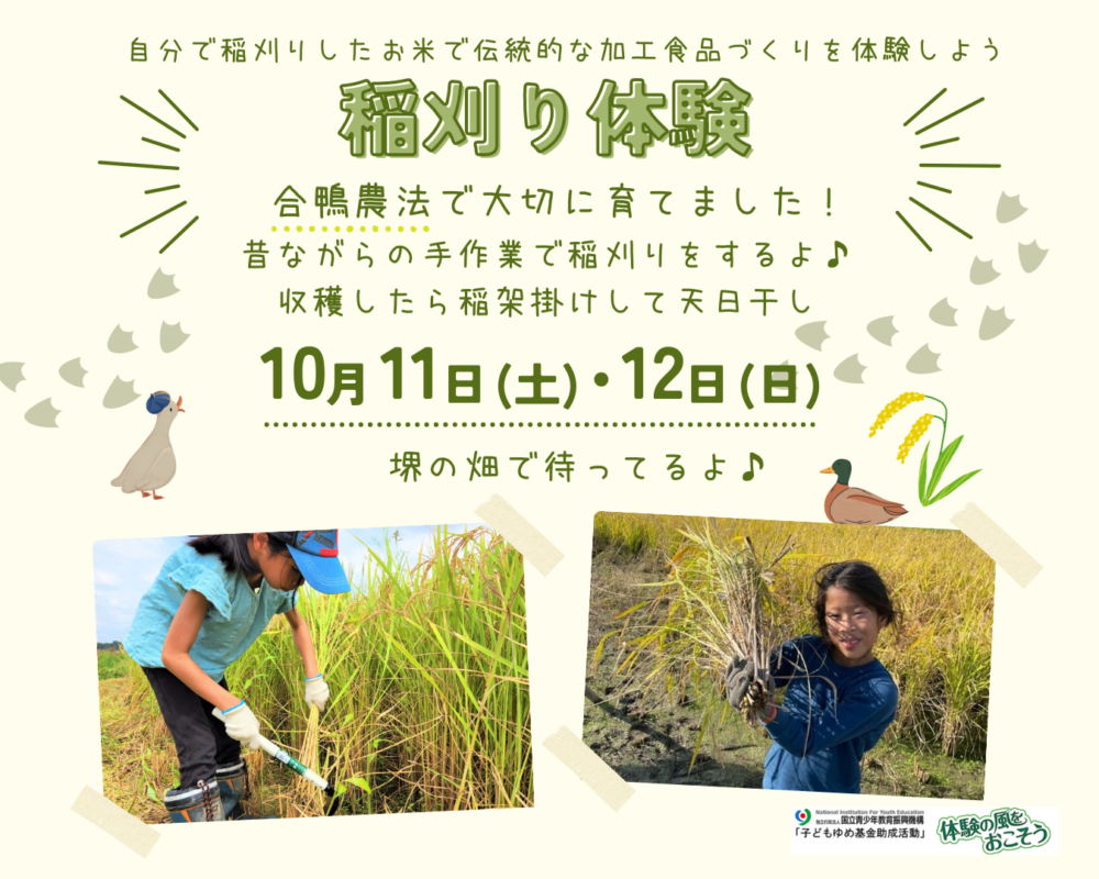 - 【募集中】稲刈り作業を体験しよう!合鴨米づくりプロジェクト2025/10/12(日)
