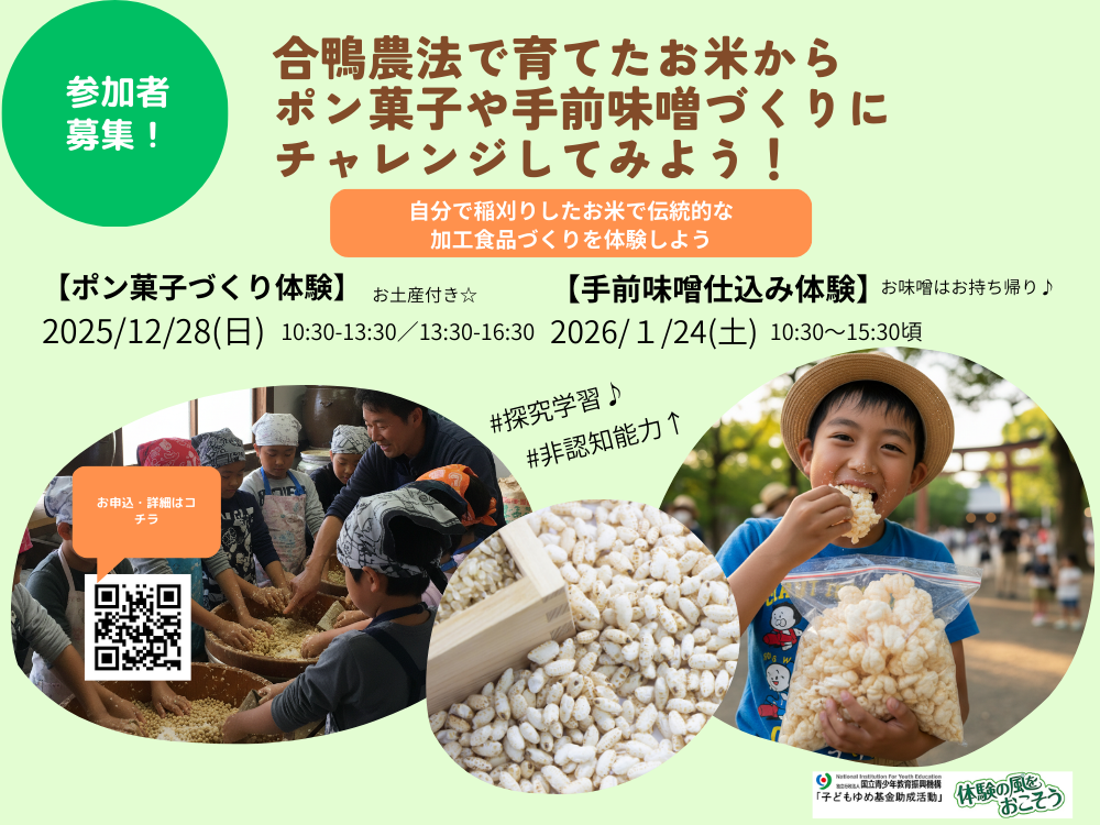 - 【募集中】合鴨農法で大事に育てたお米をつかって、ポン菓子や味噌をつくってみよう!2025/12/28(日)