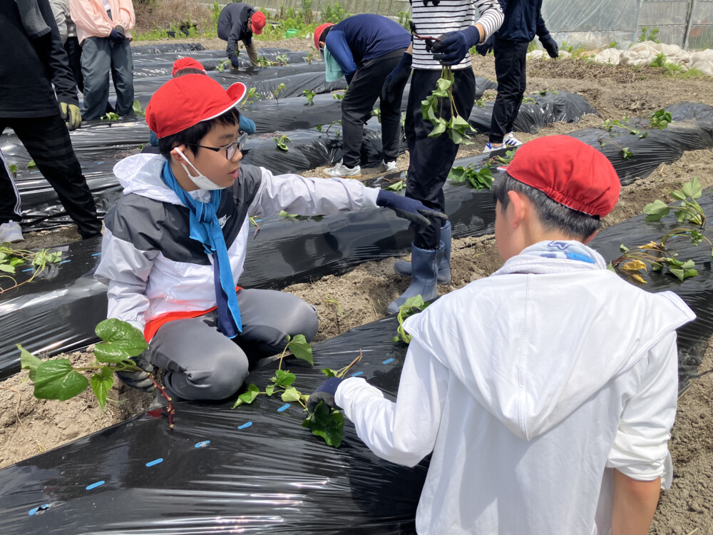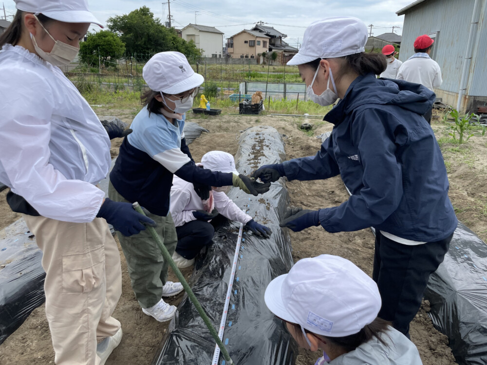5月下旬に大阪府貝塚市の川崎農園さんの畑で農業体験を行いました。この日の体験では、さつまいもと枝豆の苗を植える作業や畑の草抜きの作業を行いました。1日だけの体験でしたが、農家の方々が普段どのような工夫や努力をされているかについて学ぶ貴重な機会となりました。今年度は、この日の農作業で関わらせていただいた「さつまいも」と「枝豆」を使った加工商品を開発することになりました。