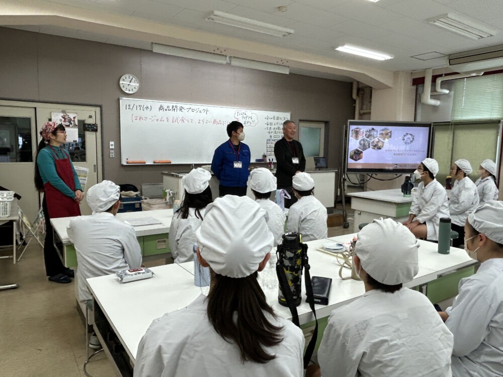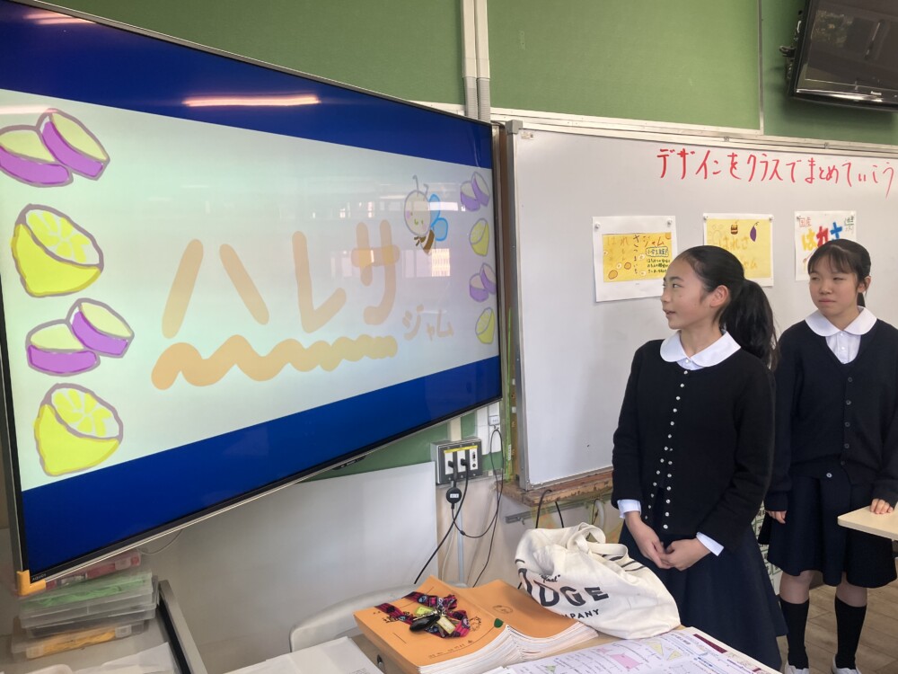 デザイナーさんの加藤さんにデザインについて授業をしていただきました。デザインによって、商品を買いに来た人がどのような印象を受けるかが変わるということを教えていただき、実際にどのようなデザインにしていけばよいかクラスで考えていきました。各班がデザイン案を考え、クラスの友だちにプレゼンテーションをしました。どの案もそれぞれが個性が出ていたので、意見が分かれましたが、最終的にはそれぞれのよいところを取り入れて、クラスとして一つのデザインにまとめることができました。商品を手に取られた際には、パッケージの工夫をどうぞご覧ください。