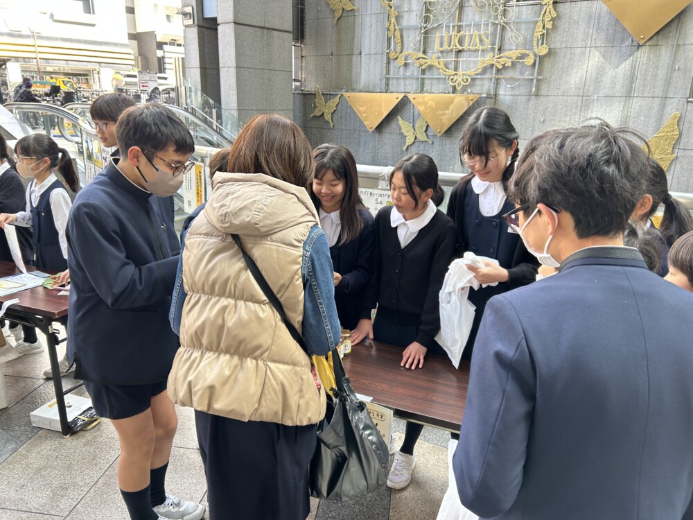 できあがった商品にラベルシールを貼り、いよいよ販売です!丸い瓶にラベルシールを貼るのは少し難しかったのですが、心を込めて一つ一つ貼りました。販売は、天王寺MIOやあべのキューズモール、あべのルシアスの方々の協力を得て、一角をお借りして販売させていただきました。見知らぬ人に声をかけるのに最初は勇気が要りましたが、自分たちの商品を買ってほしいという思いから大きな声を出して呼び込みをすることができるようになりました。「はれさジャム」だけでは何のジャムかわからないので、商品の紹介や魅力を伝えながら販売しました。足を止めて話を聞いてくださったり、商品を買ってくださったりしたときには、本当に嬉しかったです!!