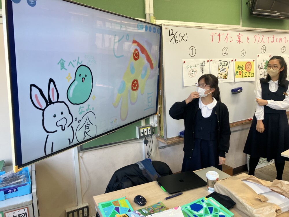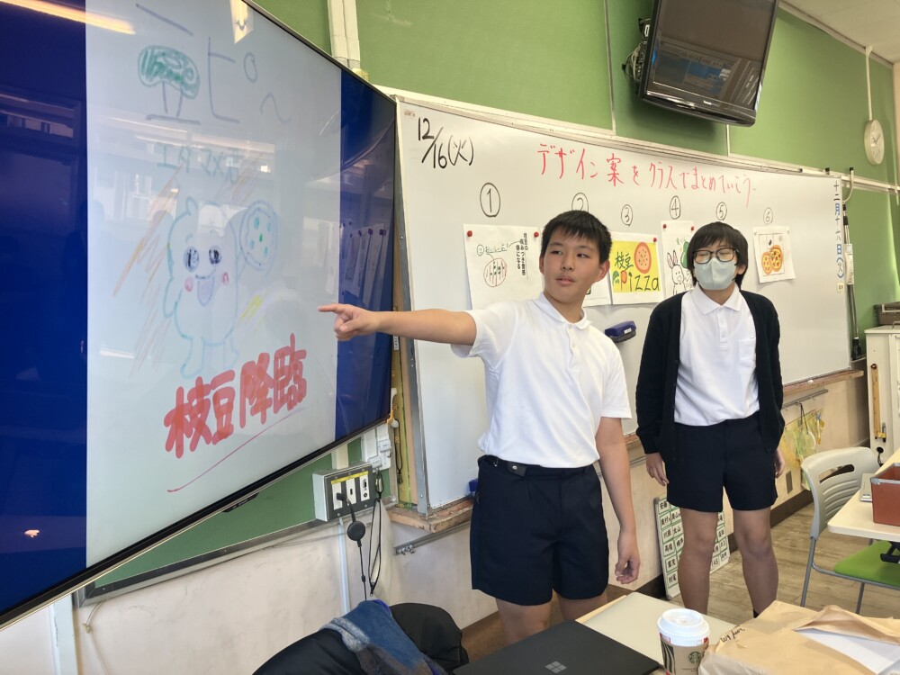 デザイナーさんの加藤さんにデザインについて授業をしていただきました。デザインによって、商品を買いに来た人がどのような印象を受けるかが変わるということを教えていただき、実際にどのようなデザインにしていけばよいかについてクラスで考えていきました。各班がデザイン案を考えクラスの友だちにプレゼンしました。クラスの中で2つの班のアイデアが、最終的にはクラスとして1つのデザインにまとめることができました。推しとして残ったので