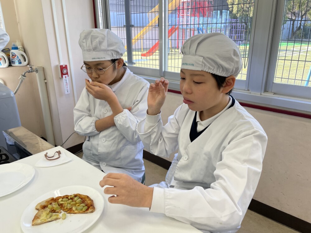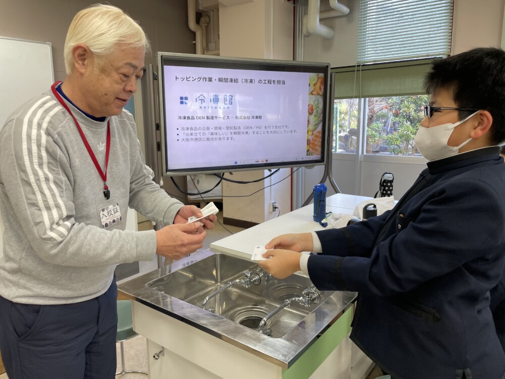 冷凍食品ということもあり,大阪市の企業様(冷凍館)にお越しいただき,急速冷凍する仕組みや商品を販売するうえで大切なことについてお話いただきました。そのあと,3種類のピザを試食し,商品化に向けてどの味のピザがよいか考えました。最終的に2つの味が楽しめるハーフ&ハーフのピザにして販売することに決まりました。