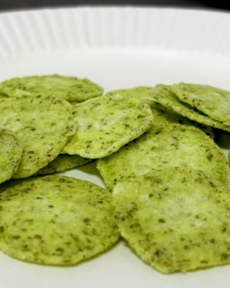 • 「チップスthe黒菜」とは、名前の通り黒菜を使ったチップスです。少し丸く、パリパリとした食感で、黒菜を粉じょうにしたものをかけました。黒菜を活かしたチップスなので、黒菜の味がよく味わえるので、是非食べてみてください。