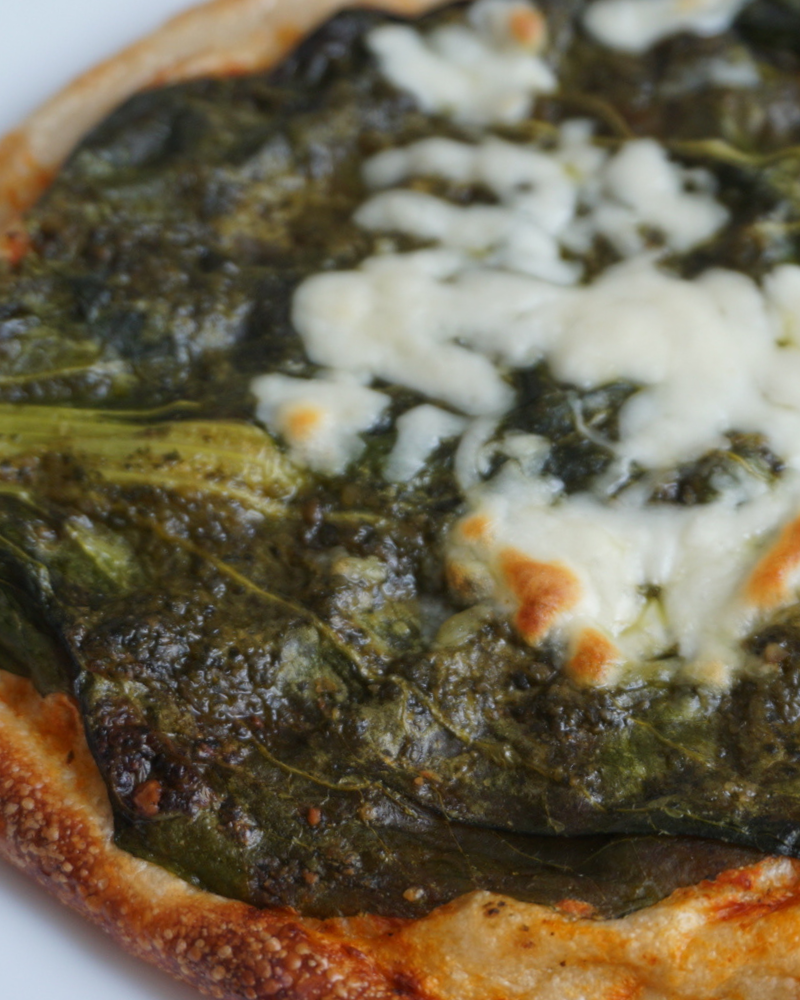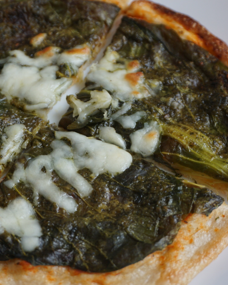 ・「なにわの黒菜ピザ」は、大阪くろなの葉を丸々使うだけでなく、具材やジェノベーゼ風ソースにも使い、大阪くろなをたっぷり使いました。その上にチーズをドン!と乗せています。黒菜は鉄分、ビタミンなどの栄養が豊富に入っています。しかも、蹉跎小がある地元枚方で作られています。新鮮な野菜を使った黒菜ピザです。是非食べてみてください。