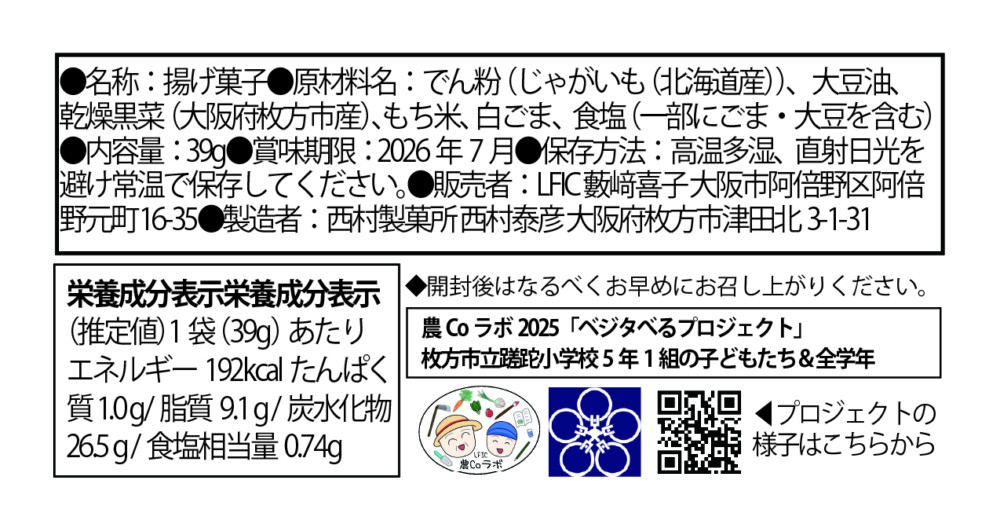 馬鈴薯澱粉(じゃがいも(北海道産))、大豆油、乾燥黒菜(大阪府枚方市産)、もち米、白ゴマ、食塩