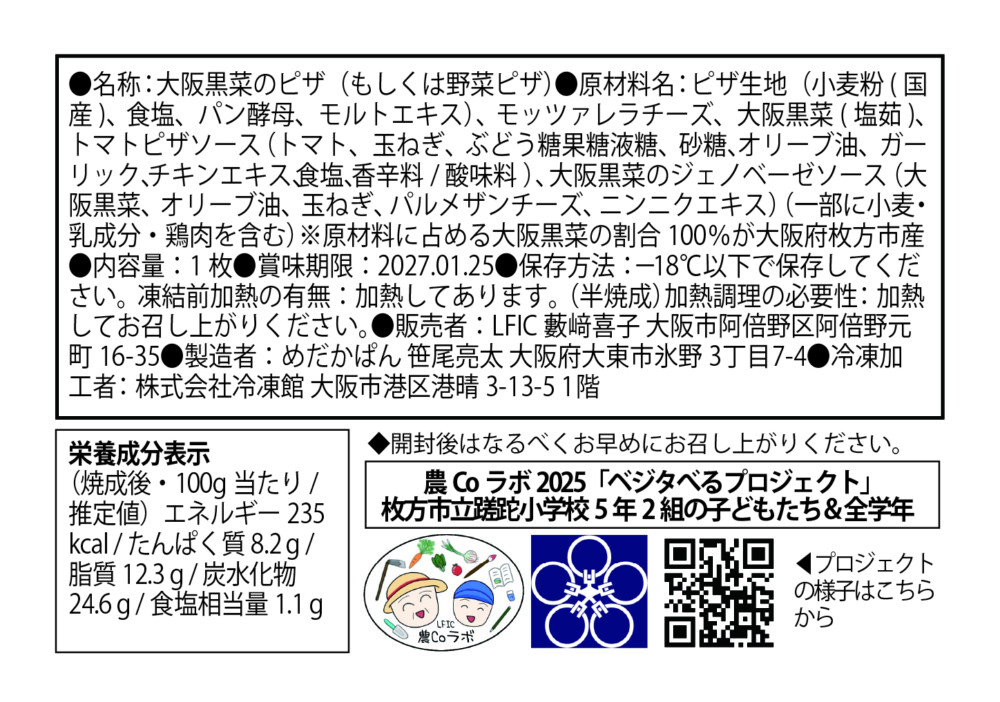 ピザ生地(小麦粉(国産)、食塩、パン酵母、モルトエキス)、モッツァレラチーズ、大阪黒菜(塩茹)、トマトピザソース(トマト、玉ねぎ、ぶどう糖果糖液糖、砂糖、オリーブ油、ガーリック、チキンエキス、食塩、香辛料/ 酸味料 )、大阪黒菜のジェノベーゼソース(大阪黒菜、オリーブ油、玉ねぎ、パルメザンチーズ、ニンニクエキス)(一部に小麦・乳成分・鶏肉を含む)