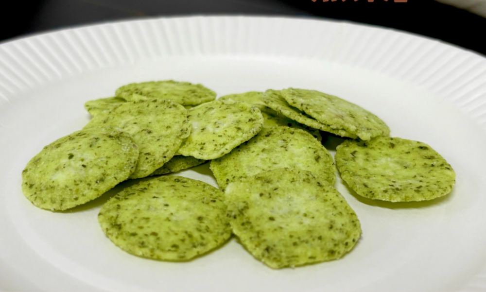 • 「チップスthe黒菜」とは、名前の通り黒菜を使ったチップスです。少し丸く、パリパリとした食感で、黒菜を粉じょうにしたものをかけました。黒菜を活かしたチップスなので、黒菜の味がよく味わえるので、是非食べてみてください。