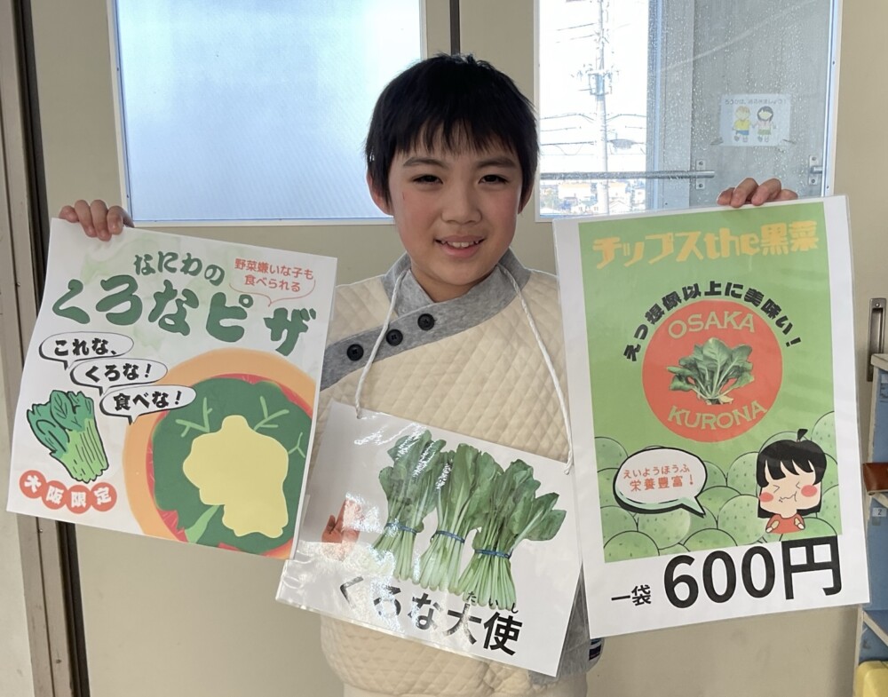 さだ小学校の子どもたちが、農家「独歩ふぁーむ」の大島さんと、加工製造を協力してくださった「西村製菓所」さん・「中野農園」さん・「めだかぱん」さん・「冷凍館」さんと、美味しい「大阪黒菜(おおさかくろな)」の商品を開発しました!!