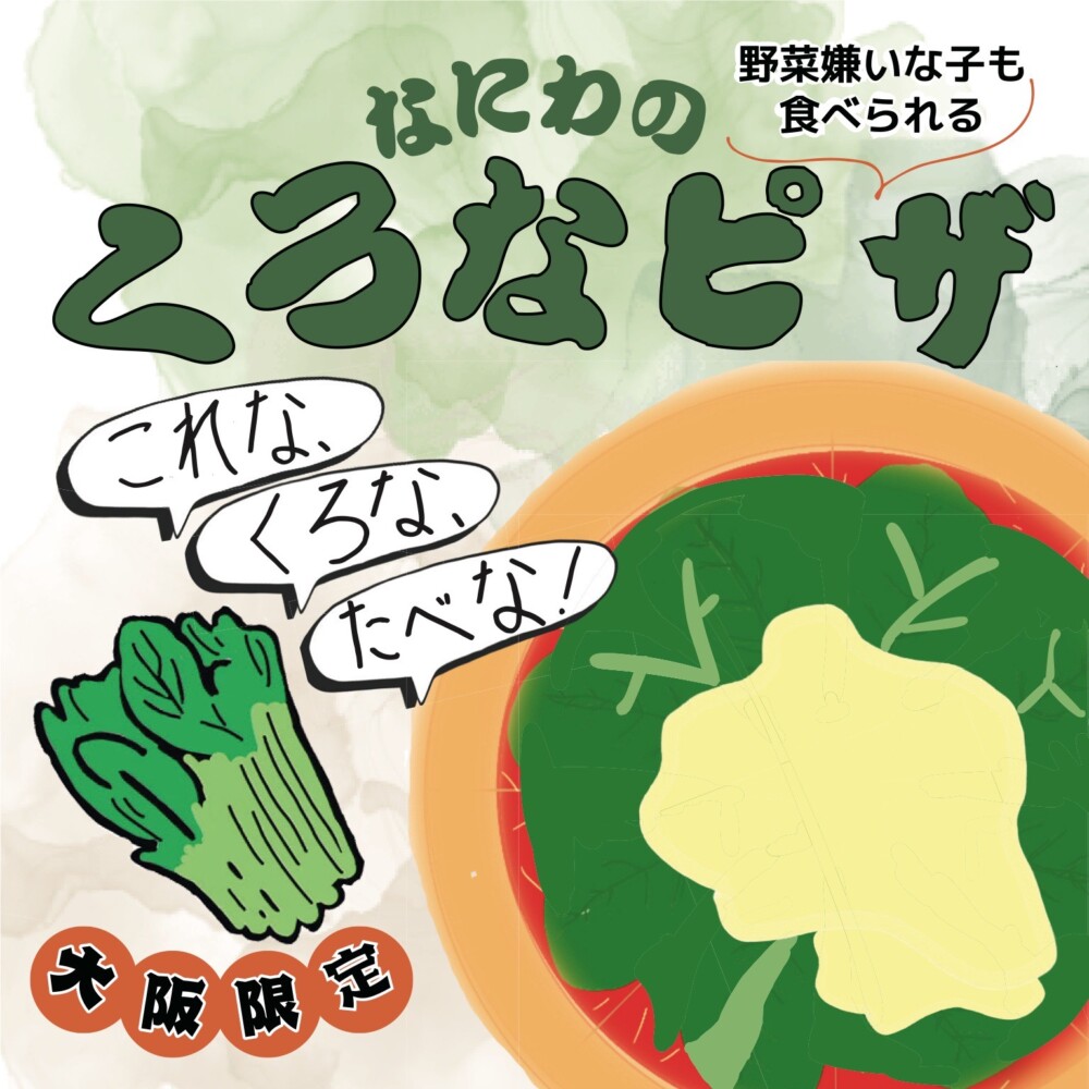 ・「なにわの黒菜ピザ」は、大阪くろなの葉を丸々使うだけでなく、具材やジェノベーゼ風ソースにも使い、大阪くろなをたっぷり使いました。その上にチーズをドン!と乗せています。黒菜は鉄分、ビタミンなどの栄養が豊富に入っています。しかも、蹉跎小がある地元枚方で作られています。新鮮な野菜を使った黒菜ピザです。是非食べてみてください。