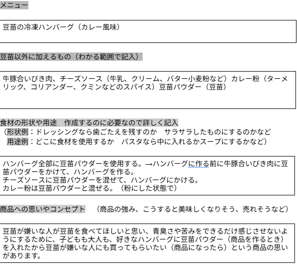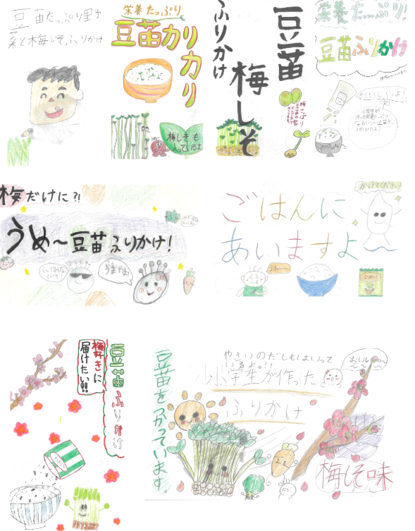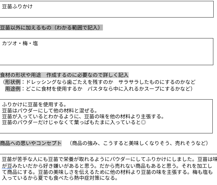 桜台小学校5年生それぞれが企画書を作成しました。最終的には「ふりかけ」が完成しましたが、給食にも出てくる豆苗という原材料だけ決まっている中で、1つの野菜だけでも多種多様な加工の仕方や食べ方があるのだと気づき、知ることができました。