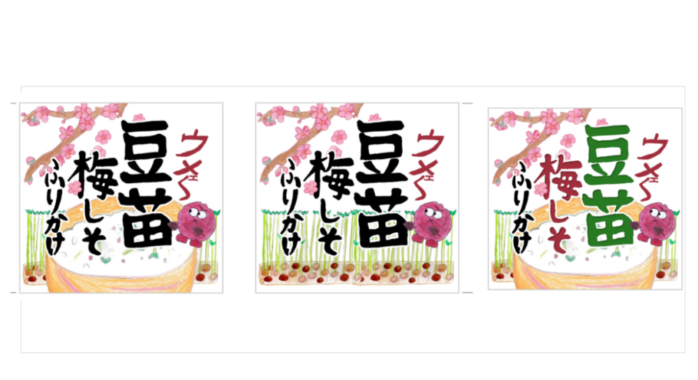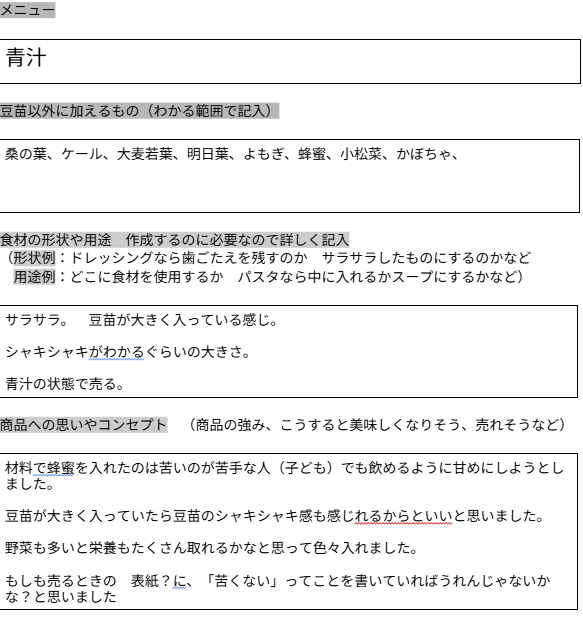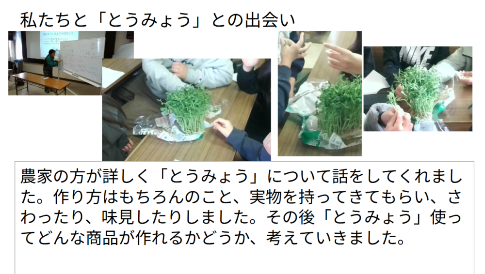 いつもスーパーやコンビニなどで買っている様々な商品が…完成するまでにこんなにたくさんの困難があったとは!地元で作られた原材料(豆苗)のことを知ることから始まり、作っている方々の想いを聞き、豆苗の可能性(商品化)を探り、販売までの工程を知り、デザインの巧妙さを学び、悩み協力し出来上がりまでたどり着きました。